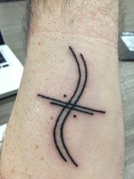 A man as a tattoo of thin black lines on his inner forearm.