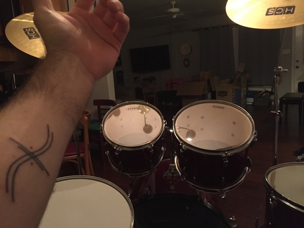 A mans forearm with a simple tattoo is shown in front of a drum kit.