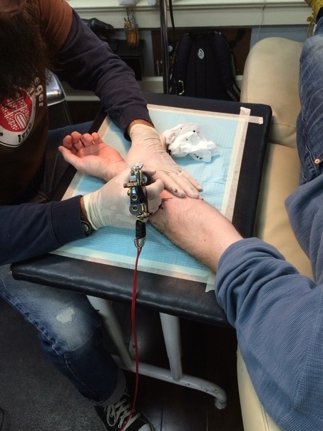 He is getting a tattoo on his left arm, on the inner side.