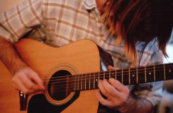 A long blonde haired guy playing on a wooden acoustic guitar.