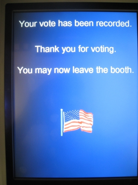 A view of the screen at a voting both after voting, it is blue and has an American flag.