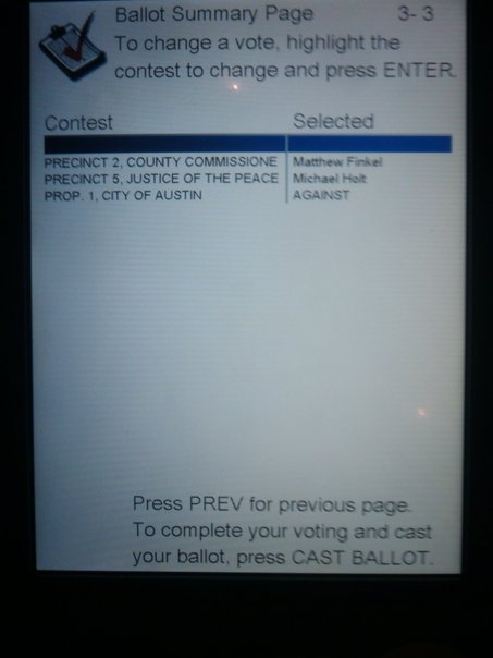 ![]() My Voting Record Austin, TX I've done the best I can to take photos of all of the electronic polls that I've submitted. This album is a compilation of those answers from local, state, and national elections over the past several years. In this album: Don Zimmerman, Ron Paul |