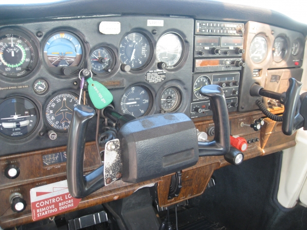 Accelerometer Airspeed Indicator Altimeter Artificial Horizon Clock Control Lock Gyroscopic Compass Left Fuel Tank Mixture Knob Primer Radio Panels Right Rudder Pedal Squawk Box Suction Gauge Tachometer Throttle Trim Wheel Turn Coordinator Vertical Speed Indicator Yoke
