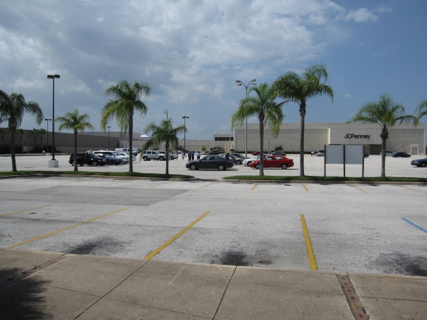 This photo shows a parking lot with multiple cars parked behind palm trees and in front of a shopping mall with individuals standing outside talking.