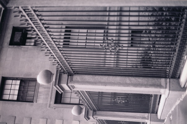 A black and white photo of a fancy gate made of granite. |