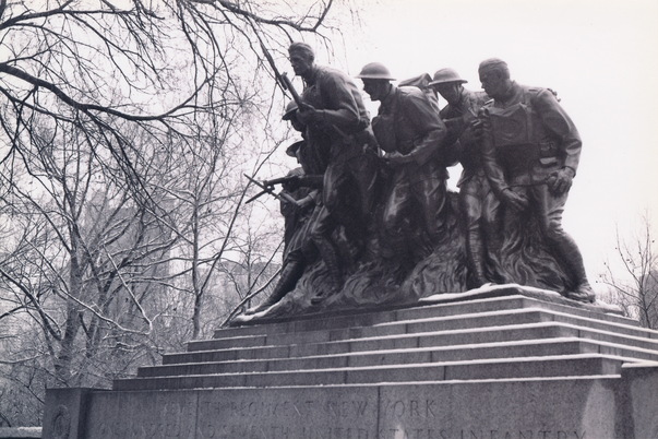 The statue of the soldiers was covered with a fine film of snow after the storm. |