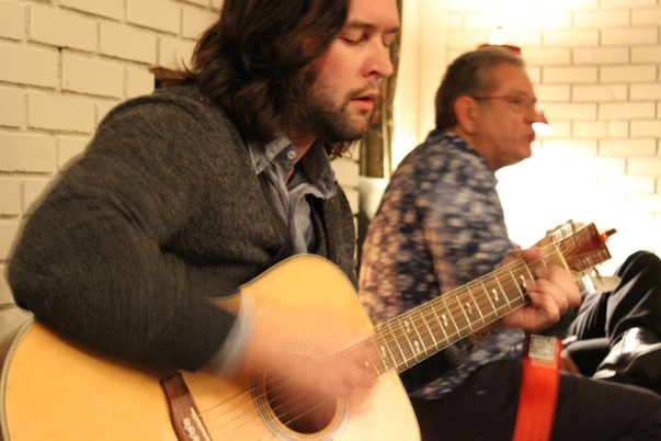 A guy with long brown hair playing the acustic guitar and enjoying it.