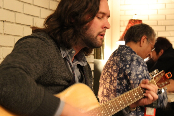 A long-haired man with a beard and moustache is playing an acoustic guitar. He is wearing a grey sweater and blue button down shirt.