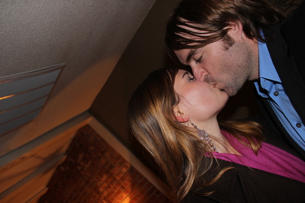 A man and woman, both wearing fairly formal outfits, kiss on the lips for a photo.
