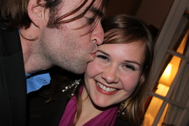 A man is kissing a young woman with a smile on her face.