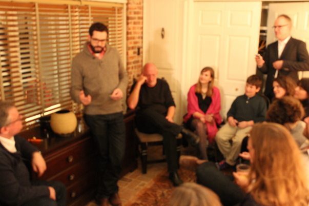 A group of people at a gathering inside of a house.