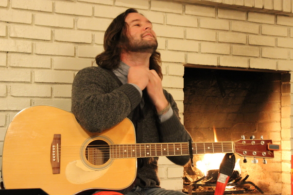 Here sits a long haired gentleman about to play a shiny guitar by a cozy fireplace.