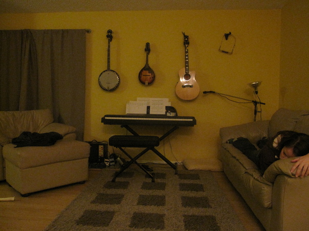 A young woman sleeping on a tan leather couch in small living room which doubles as a basic recording studio. |