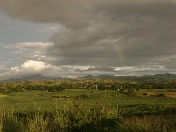 landscape photo of green hills, patchy clouds and a faintly visible rainbow.