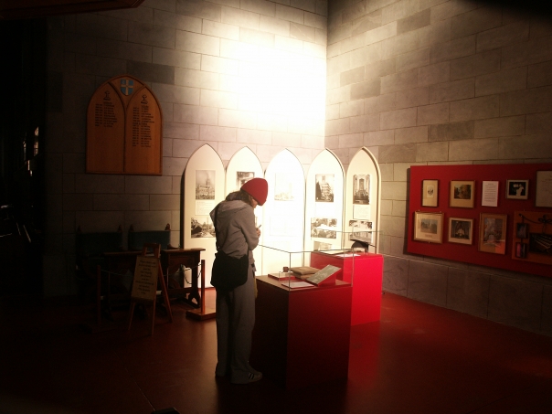A quiet museum where a lady is looking at artifacts of her ancestors.