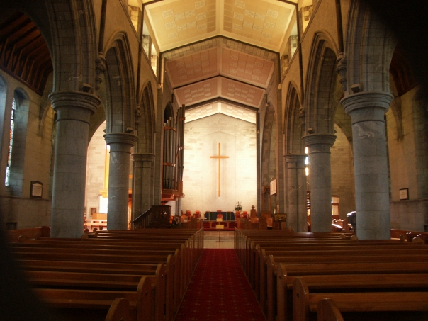 A picture of a Christian church, showing the altar and the gold cross and large pillars and pews.