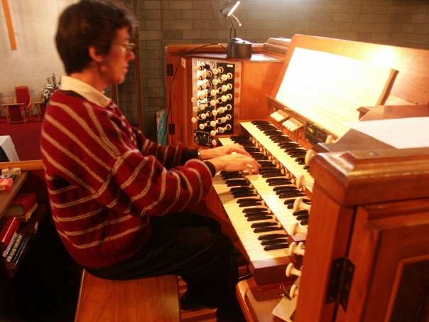 The church organist signs in front of the wooden organ playing with a sheet of music in front of her.