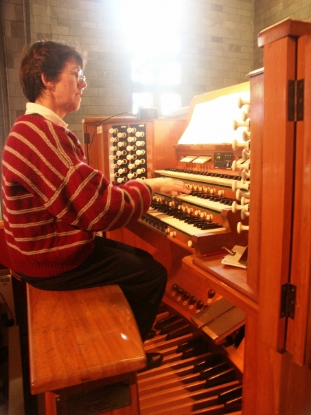 Short haired woman with glasses wearing a striped sweater playing a large organ that has three keyboards and multiple pedals.