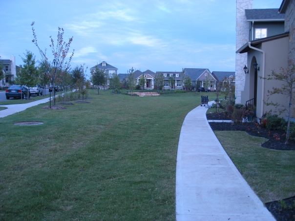 A slightly curved sidewalk going through a nice neighborhood at dusk.