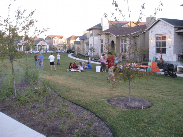There are people gathering in a picnic/event where they are on the green grass behind their homes which some either laying or standing on.