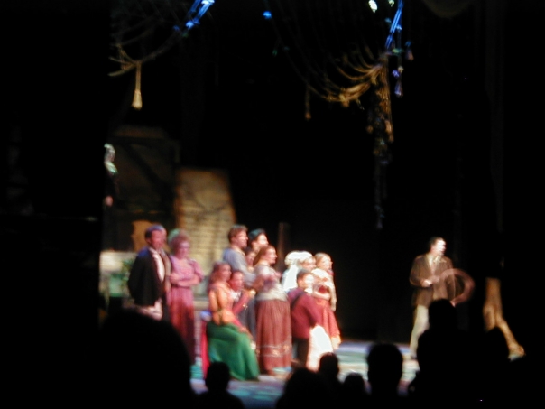People in costume perform on stage in front of an audience.