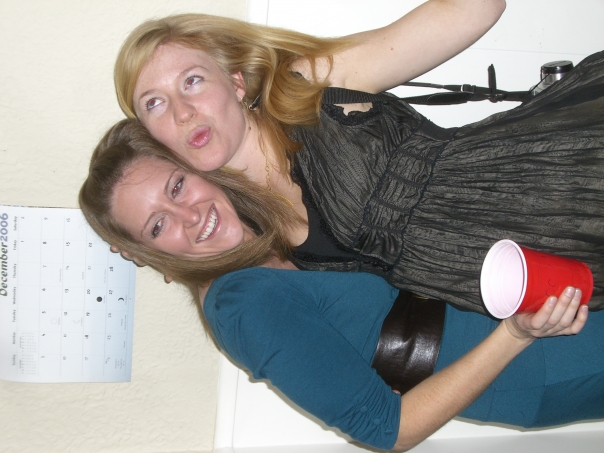 Two young ladies pose for a picture near a calendar on the wall that reads "December 2006." Blonde wears a black dress, brunette wears a blue dress with wide belt, and holds a red plastic cup.