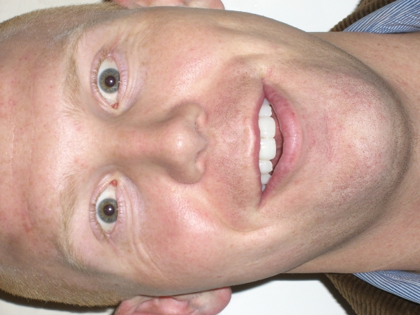 A creepy man is smiling into the camera that is bald