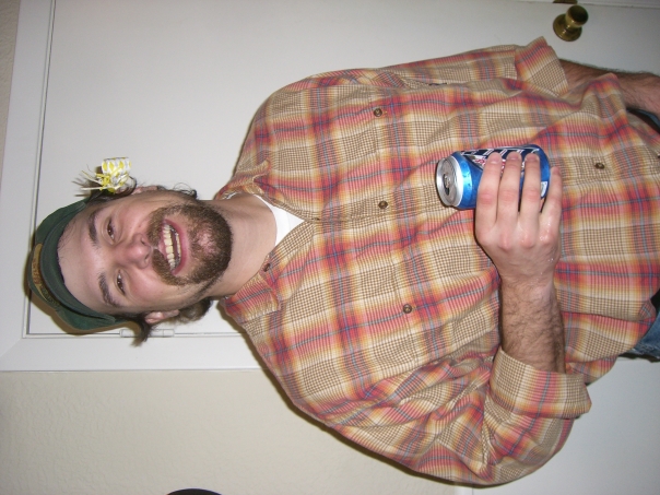 Bearded man with a beer in his hand.