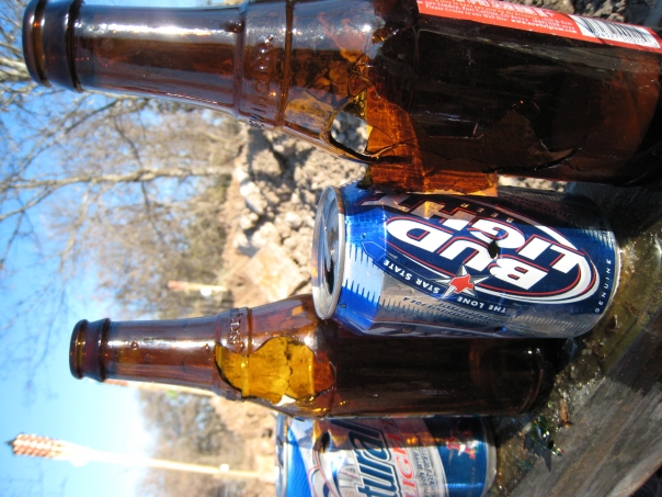 Beer cans and bottles that have been shot at