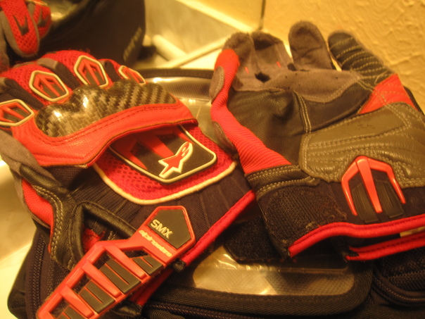 SMX motorcycle racing gloves of red and black are sitting on top of other gear.