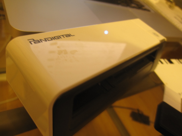 Some sort of white office device, named "Pandigital" is sitting on an office table.
