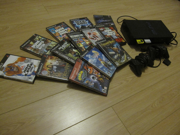 A PlayStation 2 and 13 of the console's most memorable games are laid out on the floor.