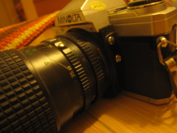 The black and grey old fashioned camera is made by Minolta.