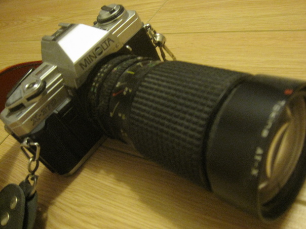 A minolta camera with a long lens is resting upon a wooden surface.