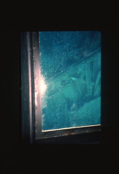 The submarine shoots picture of the wreckage of a ship through viewing mirror in it. |