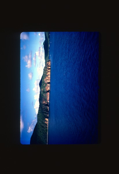 The lush green island rises from the clear blue sea.