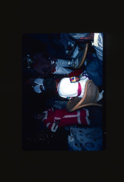 This is a dimly lit photograph of several people, a woman is wearing a red and white dress. |