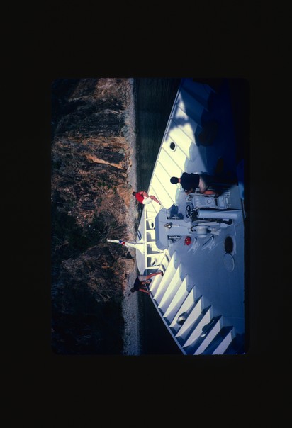 There are three men on a ship in front of a rocky shore and a big cliff. |