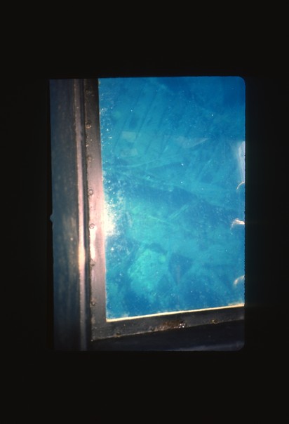 A window with a metal frame around the edges and blue hues showing through the glass. |