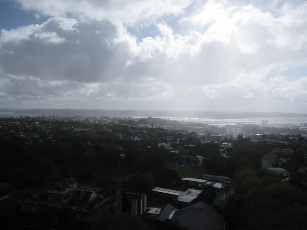 The city is in the shadows while the water is illuminated by the sun. |
