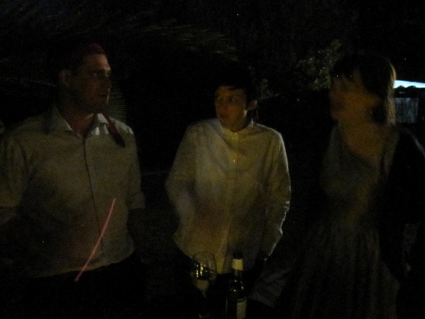 3 people in white talking around a glass of wine next to a bottle of wine. |