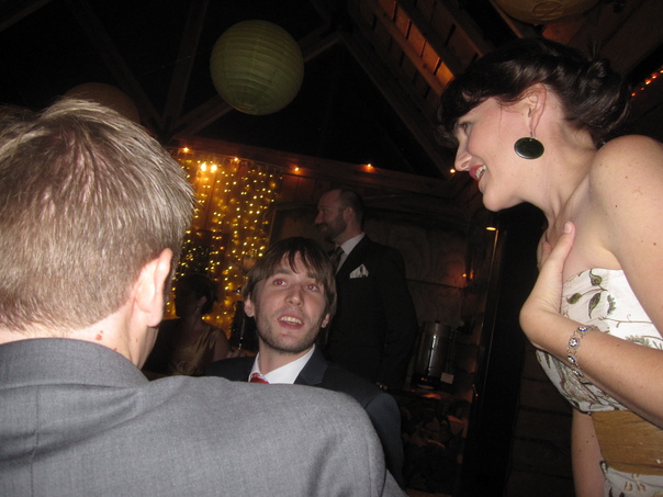Two young men in suits talk to a woman wearing a bare shoulder dress. |