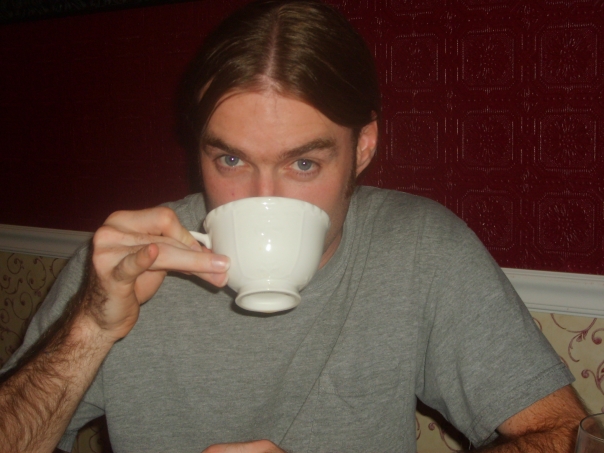 Young man in grey t-shirt drinking from a tea cup with his pinky aloft.
