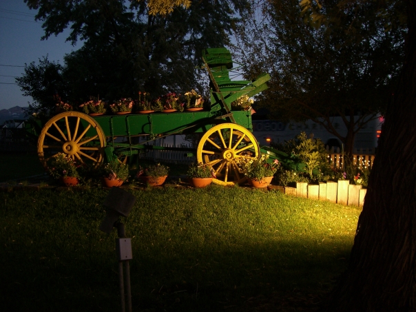 A large green tractor wagon with yellow wheels is on the edge of a lawn, covered in potted flowers.