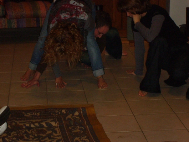 "There are three adults playing twister with out the game."