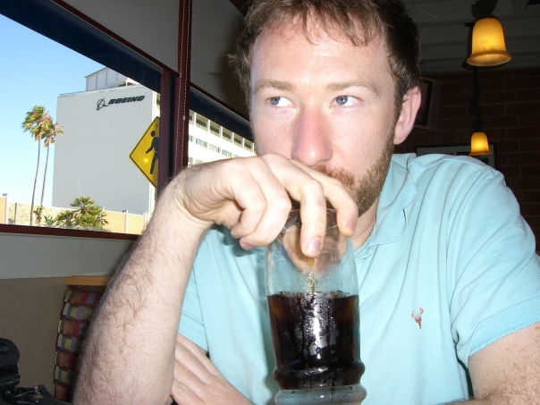 A man in a light blue shirt with a beard sips a cola from a glass with a straw, a Boeing building can be seen through the window.