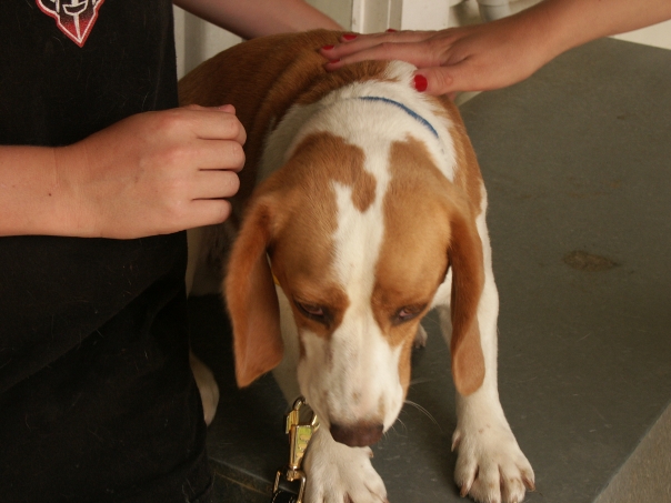 Brown and white hound dog on the examining table being touched by twopeople.