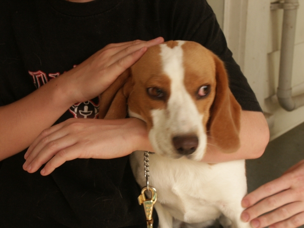 person wearing black shirt petting brown and white dog whois wearing a chain hanging from neck