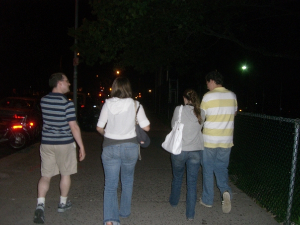 two men and two women walking down the side walk at nigh time