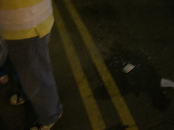 What is seen is a portion of person's body while that person is standing in the middle of a road. There is pavemnt with two broad yellow lines together much like you see in a no passing zone on a highway. There looks to be some paper litter on the road. There is not enough shown of the person to identifly their sex but they are wearing a yellow shirt with some gauzy white fabric wrapped around the bottom of the shirt. The person is wearing jeans and sandy-colored shoes with dark shoelaces.